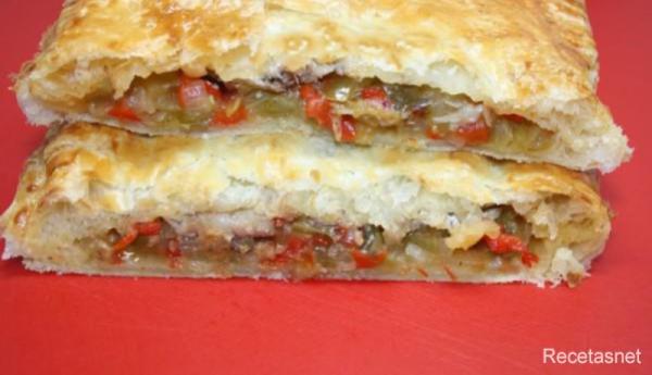Forrar el molde con una de las porciones, se añade el sofrito de cebolla y pimientos, se ponen las sardinas por encima y se tapa con la otra porción de masa estirada.