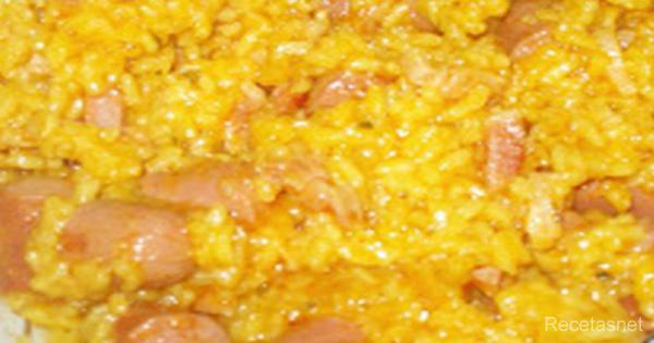 Se pone en una cacerola la mitad de la manteqilla y la mitad de la cebolla bien picadita, y cuando empieza a dorarse se echa el arroz y se rehogan bien, se agrega un litro de agua, sal y pimienta, y se deja cocer durante veinte minutos.Con la otra mitad de la manteqiñlla se fríe el resto de la cebolla y el jamón partido en cuadritos.Se agrega el puré de tomate, sal, pimienta y un poco de azúcar.Se moldea el arroz en forma de rosca, se echa en el centro el refrito y los huevos fritos alrededor.
